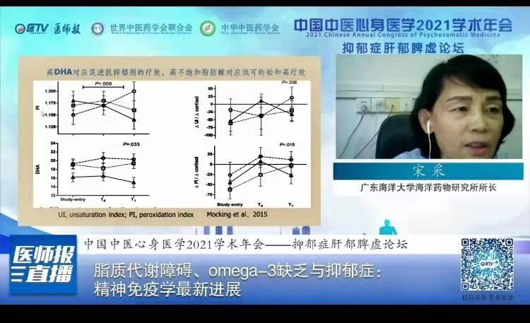 我校食品科技学院海洋药物研究所宋采教授(心身医学分会副会长)受邀在线上主持了抑郁症肝郁脾虚论坛并作了题为“脂质代谢障碍、Omega-3缺乏与抑郁症:精神免疫学最新进展”报告。本论坛邀请了来自北京中医药大学、上海交通大学、山西大学和广东海洋大学等单位的6名专家作报告。论坛从蛋白组学、代谢组学、脂质代谢、中药辩证诊断和治疗以及线粒体和突触微环境等方面揭示了肝脾功能失调在抑郁症发病和发展的内涵以及与中医诊断和治疗的切合点。人民日报、光明网中医频道、中国青年网、腾讯新闻、《中国临床医生杂志》、中国教育网络电视台在线播放,观看人数近30万。此论坛在将中医药国际化和开创中西医共同研究和治疗抑郁症方面发挥了重要的影响。